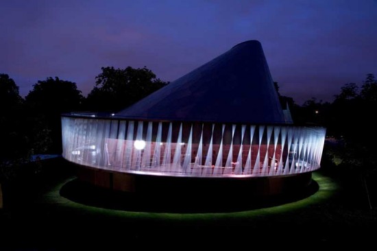 The Bradley Collection was a Bronze Sponsor for the 2007 Serpentine Gallery Pavilion. The pavilion was designed by Olafur Elisson and Kjetil Thorsen. Bradley was approached by architects from the Snøhetta practice, to design and install one of the most challenging pole systems yet. The brief was for a 50mm diameter, 30m long spiraling curved pole to be fitted with 11 custom passing brackets (each one different). Special custom ‘C’ rings had to be developed to pass the new bracket design. The timeframe for the project was incredibly tight as we undertook the entire project from design through installation in under 4 weeks.